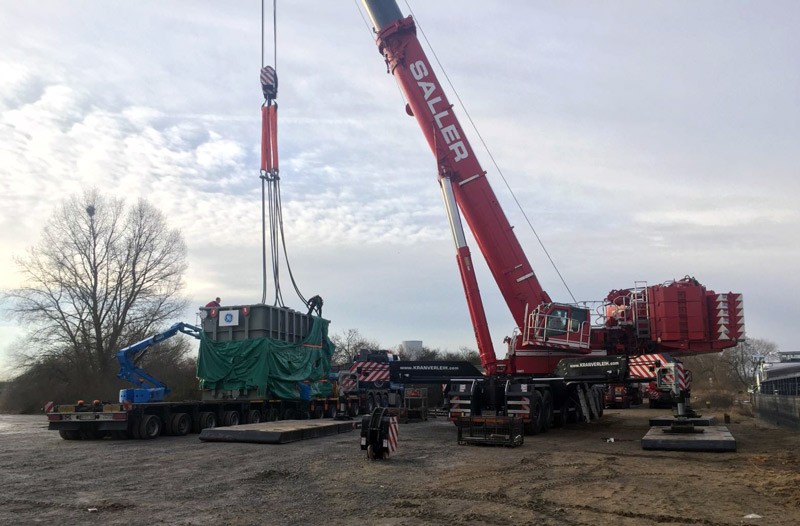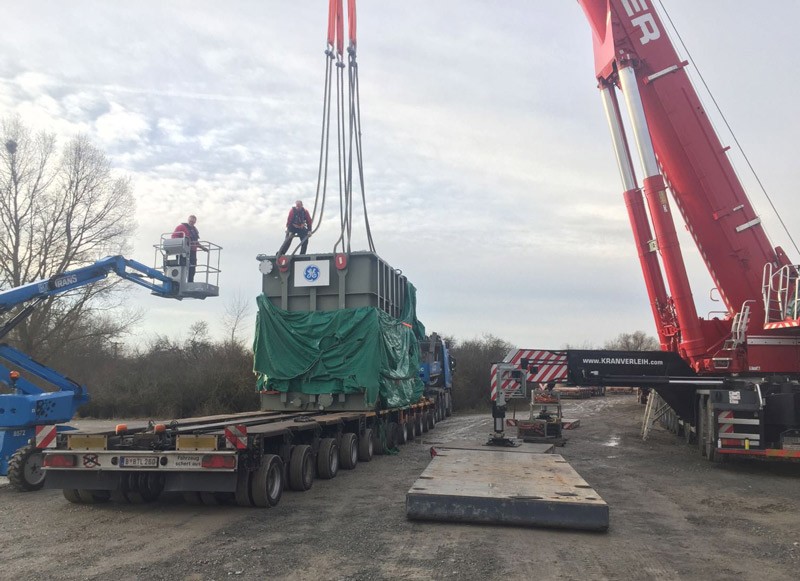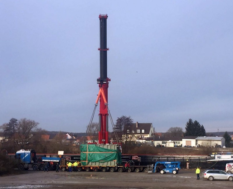 Bergrheinfeld Hafenlände hieß der Einsatzort des größten Teleskopautokranes Bayerns, dem LTM 1750-9.1 zu Anfang Februar. Aufgabenstellung war es, 3 Trafos mit je 122 Tonnen netto Gewicht auf 17 m Ausladung von einem Binnenschiff zu entladen und auf Schwertransportfahrzeuge umzuschlagen.