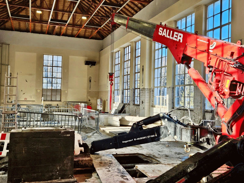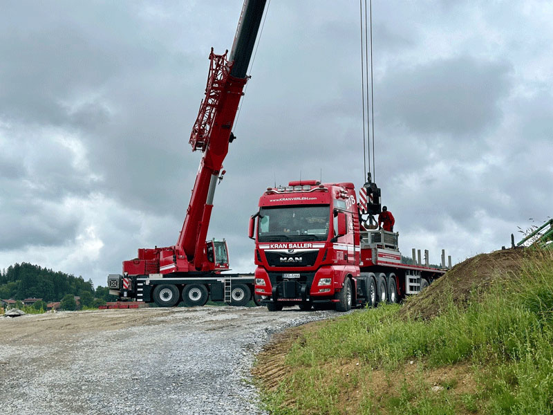Einsatzbilder unseres Liebherr LTM 1250-5.1 (250 Tonnen-Klasse) bei Kirchberg im Wald (Landkreis Regen/Nd. By.). Der Kran musste bei 25m Ausladung ein Fertigteilmodul von 25 Tonnen einheben. Um den Einsatz durchführen zu können, wurde der Kran mit 88 Tonnen Gegengewicht ausgestattet. Auch wurde das Gerät zusätzlich mit speziellen Hartholzplatten (Bongossi) unterbaut, um die Ausladung des Kranes minimieren zu können.