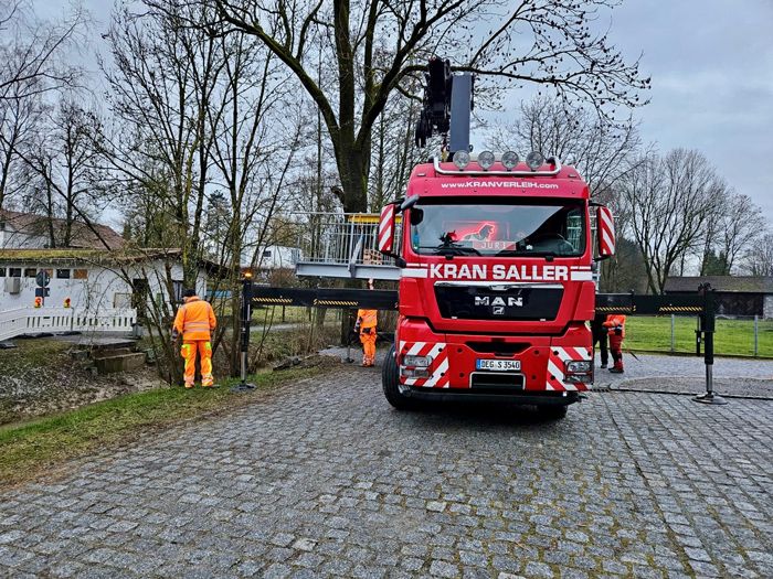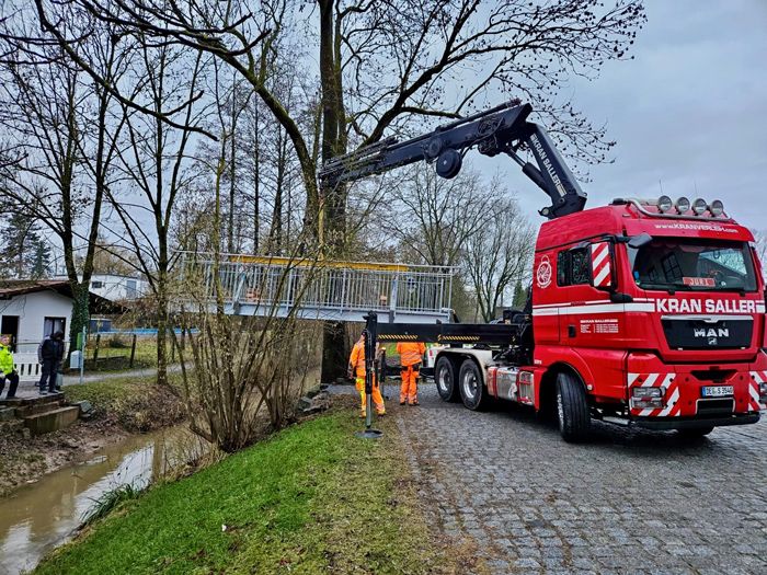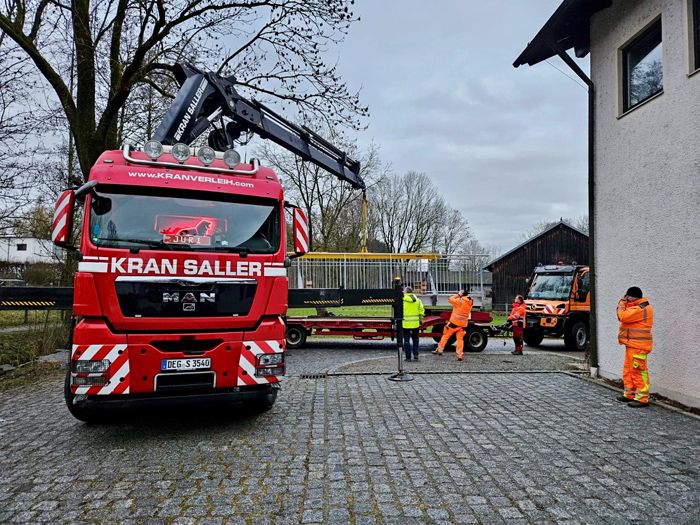 Einer unserer Ladekrankombinationen im Einsatz. Unser Hiab-Ladekranfahrzeug hat die zu hebende Stahlbrücke transportiert und im gleichen Atemzug eingehoben. Oft ergeben sich durch ein solches Fahrzeug Synergien, bei denen der Auftraggeber Zeit und vor allem Geld sparen kann. Wir freuen uns auf ihre Anfrage: +49(0)991/37180-0